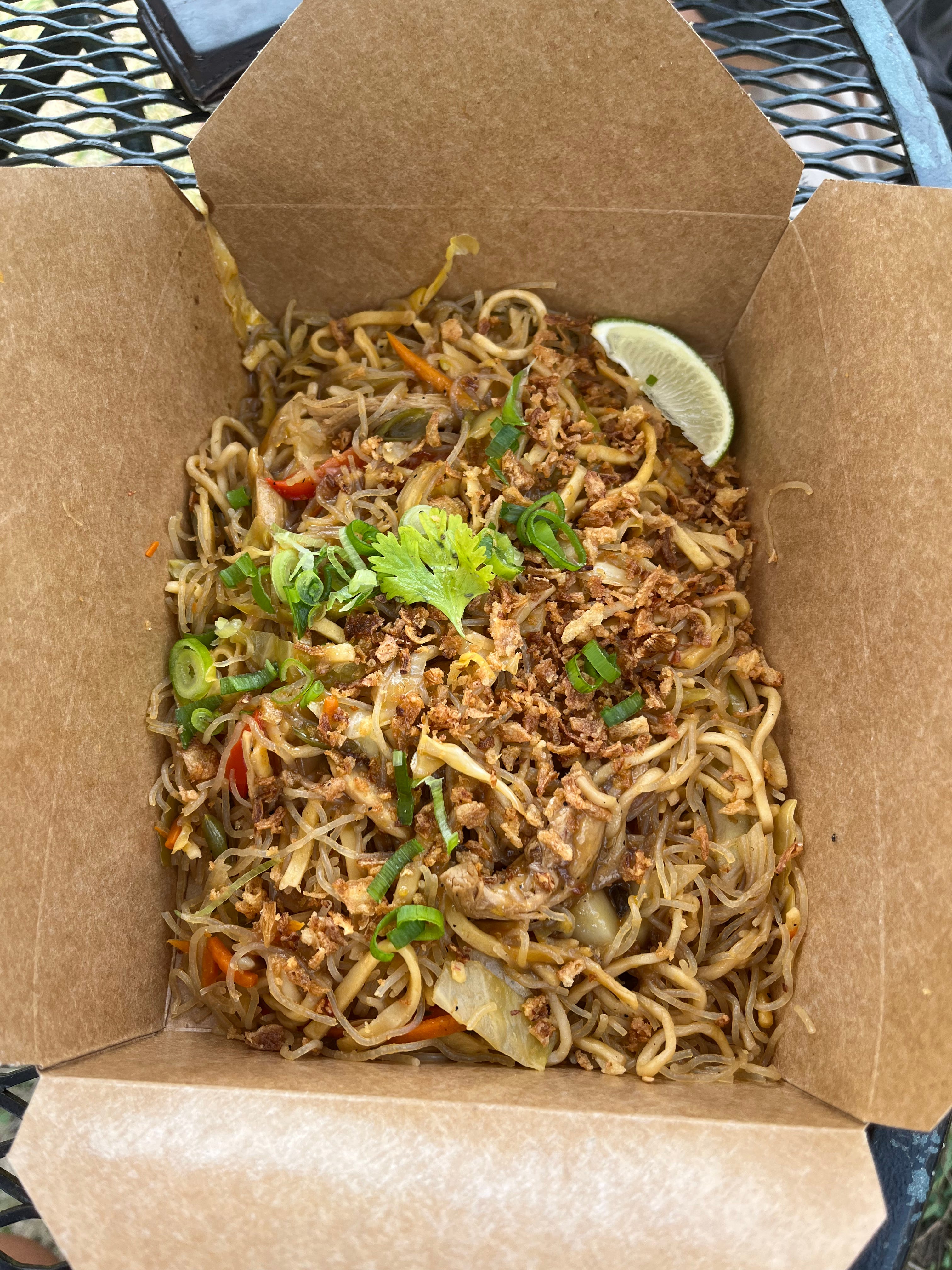Pete got the chicken adobo and the pansit. When I explained that I don’t eat meat, Romeo assured me that the pansit is made with chicken breast, so it should be fine. (I didn’t eat the chicken, but I did eat the noodles around it.) Before we left, Romeo snuck a few lumpia into our to-go container.
