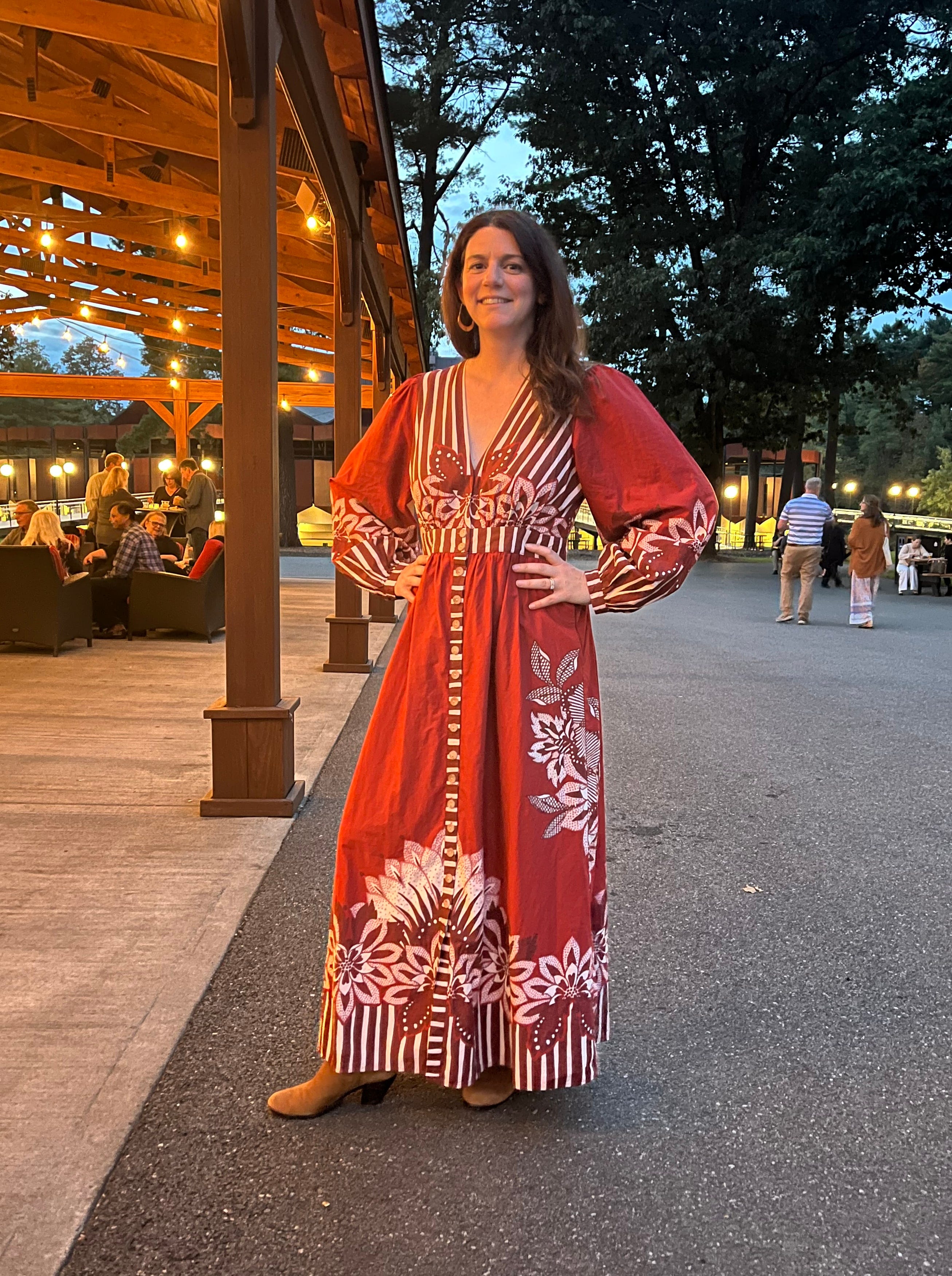 KV: Totally! This dress is that sweet spot for fall—light enough for sunny days, but easy to layer on when it cools down. I’ve always loved Farm Rio for how their pieces spark creativity. They’re not just clothes—they’re a way to express yourself and bring a little joy into everyday life. It fits perfectly with working at a performing arts center, where we get to celebrate art and artists every day.