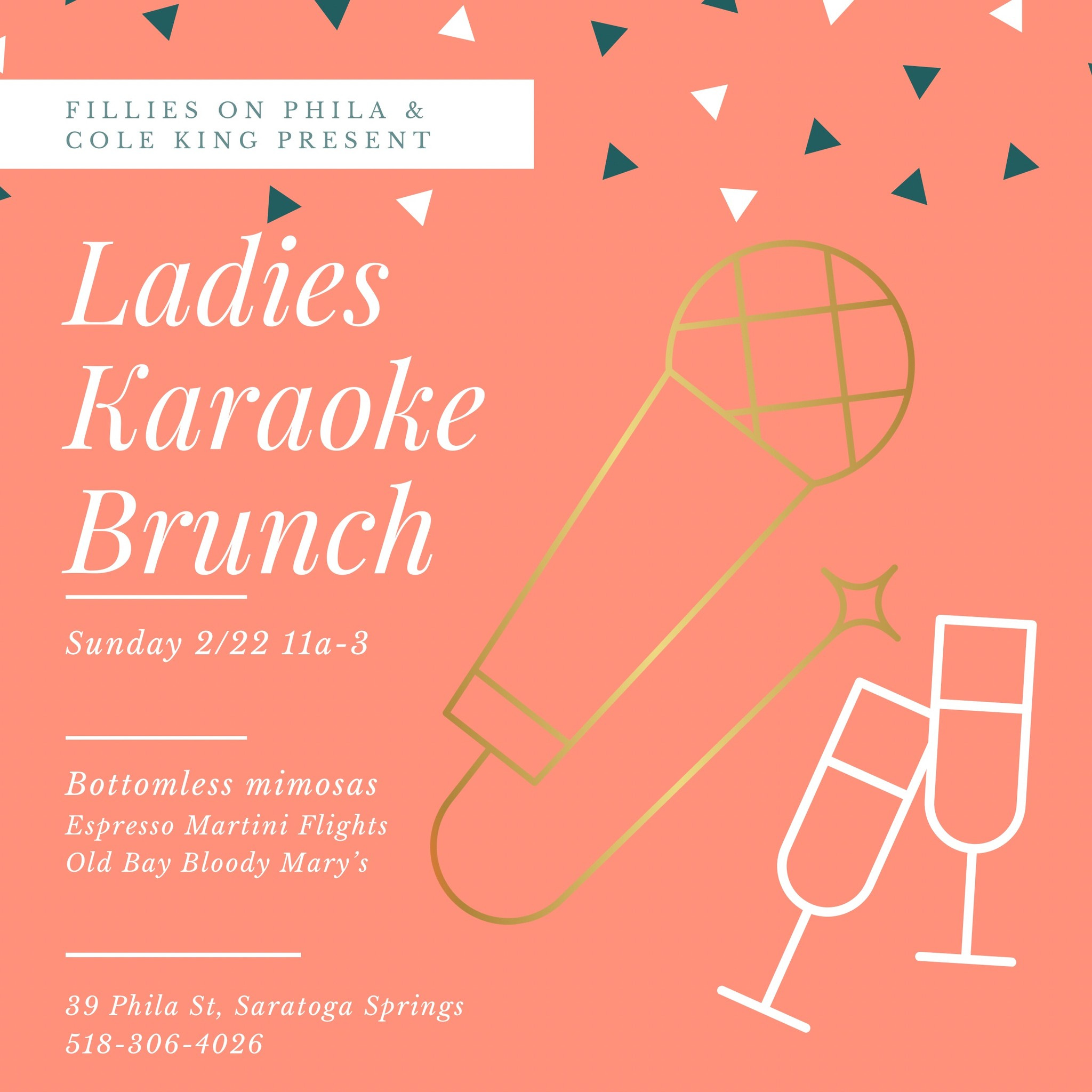 Ladies Karaoke Brunch: Brunch isn’t the only thing on the table at Fillies on Phila this Sunday…Stop by from 11am–3pm for French toast with a side of song. The bottomless mimosas will be flowing as Cole King hosts this midday karaoke party.