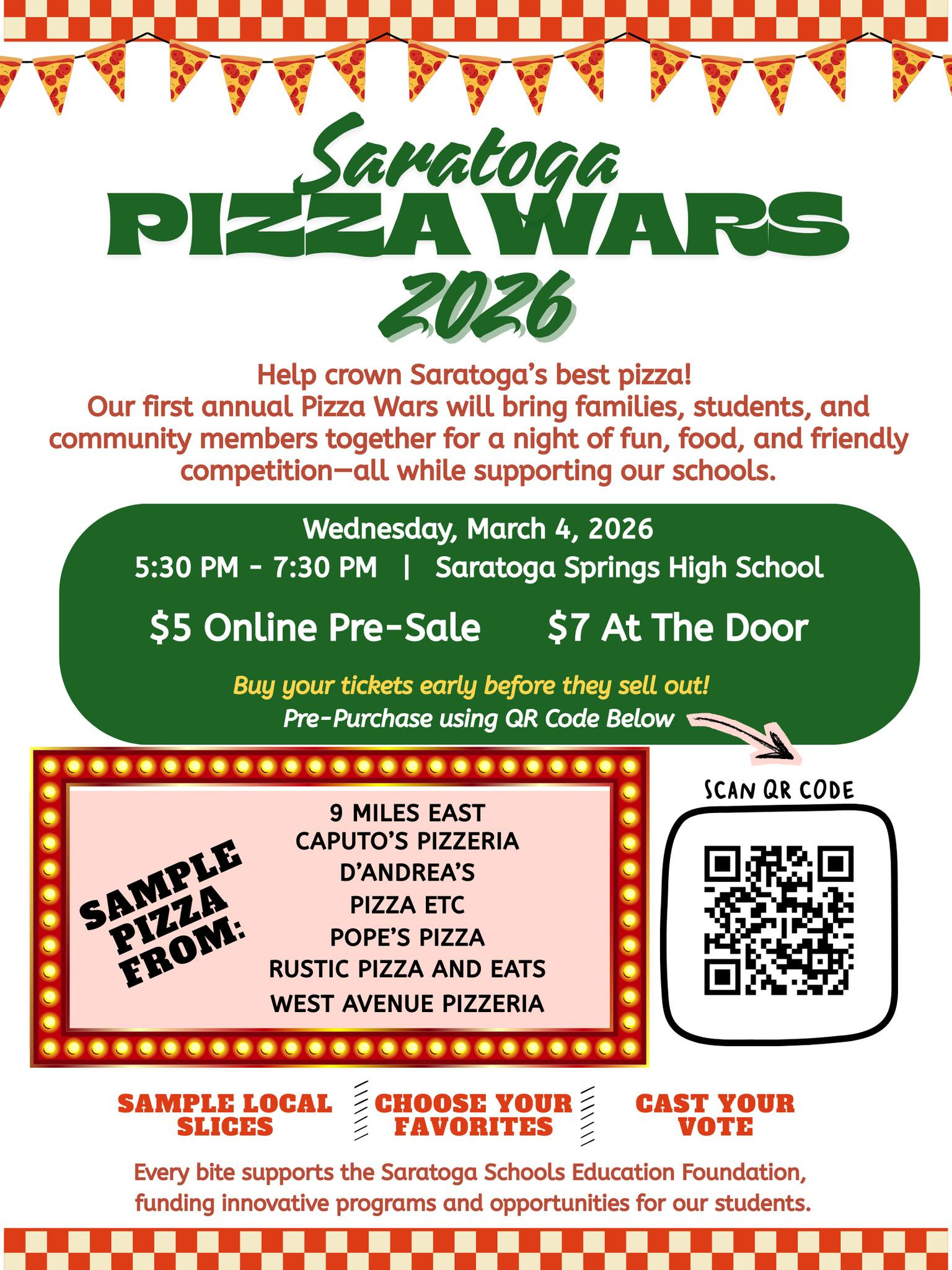 Pizza Wars: Let your tastebuds decide who will be crowned “best pizza” at the first-ever Pizza Wars, hosted by the Saratoga Schools Education Foundation at the Saratoga Springs High School cafeteria from 5:30–7:30pm this Wednesday. Seven local faves—Pizza Etc, Pope’s Pizza, Caputo’s Pizzeria, West Avenue Pizza, Rustic Pizza and Eats, D’Andrea’s, and 9 Miles East—can be sampled to support student programs and opportunities. Tickets are $5 online and $7 at the door.