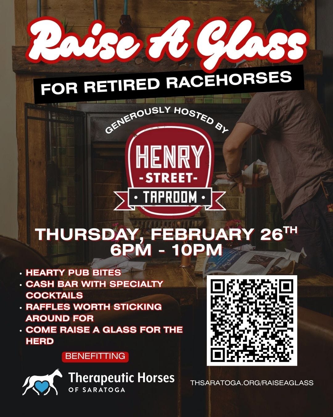 Raise a Glass for Retired Racehorses: Raise a glass for a good cause! Therapeutic Horses of Saratoga will host a get-together at Henry Street Taproom from 6–10pm on Thursday featuring hearty pub bites, raffles, and a cash bar—all in celebration of the retired racehorses who make the work of Therapeutic Horses of Saratoga possible.
